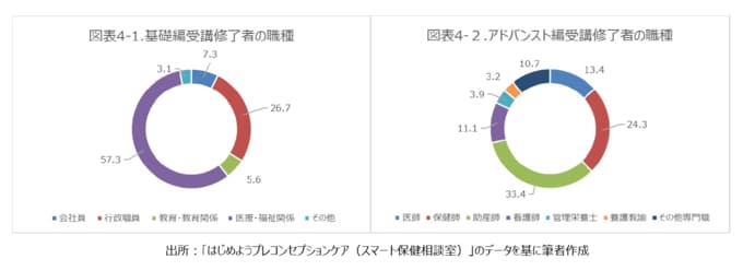 また、職種別では、基礎編においては「医療・福祉関係者」が57.3%と最多であり、アドバンスト編では「助産師」が33.4%と最も高い割合を占めている。