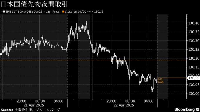 先物夜間取引で中心限月6月物は21日の日中取引終値比23銭安の130円09銭で終えた。稲留氏の先物の予想レンジは130円00銭-130円25銭、新発10年債利回りは2.385-2.410%(21日は2.38%で終了)。21日の米10年国債利回りは前営業日比4ベーシスポイント(bp、1bp=0.01%)高い4.29%程度だった。