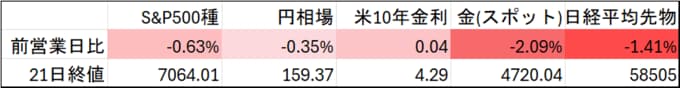 (注:表中の終値は米国時間終値。円相場は対米ドル、前営業日比は円の対ドル変化率。米10年金利の前営業日比は変化幅(単位:%ポイント)。日経平均の前営業日比はシカゴ・マーカンタイル取引所清算値と大阪取引所清算値との比較。シカゴ取引所が休場の場合は大阪取引所の前日清算値と最終取引値の比較。金は1トロイオンス当たりのドル建て価格)