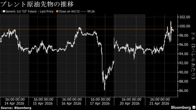 米国が設定した2週間の停戦期限が迫る中、戦闘再開という最悪のシナリオは避けられたものの、今後の協議の日程も定まらず、ホルムズ海峡の開放がさらに遠のく恐れが高まっている。米国とイランの交渉行き詰まりを受け、国際的な原油の指標であるブレント原油先物は21日の米国時間終了間際に1週間ぶりに一時1バレル=100ドル台に乗せた。トランプ氏の停戦延長表明後も原油相場は高止まりの状況が続く。