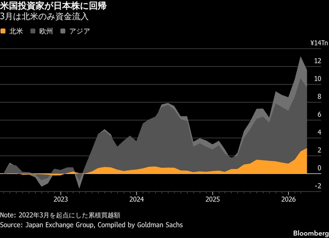 (ブルームバーグ):ゴールドマン・サックス証券は、中東危機に対するショックから市場心理が回復するのに伴い、米国の投資家が日本株に回帰しているとみている。為替の円安進行リスクが限定的であることや米国株を上回るパフォーマンスが背景にある。