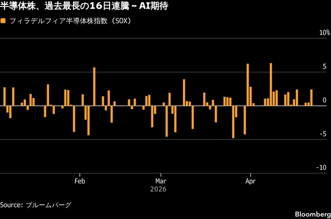 フィラデルフィア半導体株指数(SOX)は16営業日続伸し、過去最長の連騰を記録した。人工知能(AI)関連需要に支えられた同セクターへの成長期待が背景にある。ボーイングも高い。1-3月(第1四半期)の納入機数が2019年後で最多となった。引け後に決算を発表したテスラは、通常取引終了後の時間外に上昇。利益が市場予想を上回った。