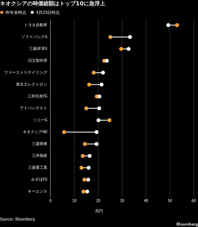 (ブルームバーグ):半導体メモリー大手、キオクシアホールディングスの株式時価総額が国内トップ10に入った。NAND型フラッシュメモリーの価格上昇による業績急拡大への期待が株価を押し上げ、昨年末の43位から大きく順位を上げた。