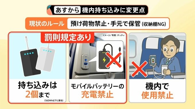 まもなくゴールデンウイーク。お出かけする予定の方も多いのではないでしょうか。注意しなければならないのが、飛行機内へのモバイルバッテリーの持ち込み。あす(24日)からルールが変わります。