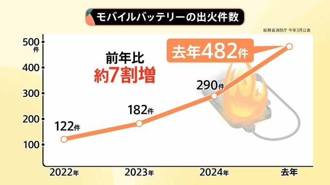 総務省消防庁の調べでは、出火件数は右肩上がりに年々増え、2025年は482件と前年より約7割も増えています。また航空機での出火も相次いでいることも踏まえ、今回のルール改正となりました。