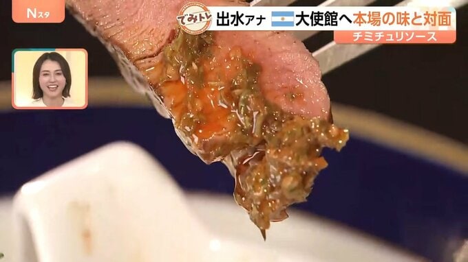 「これはアルゼンチンのソース『チミチュリ』を添えた牛肉です。牛肉を食べるときには欠かせないソースなんです」