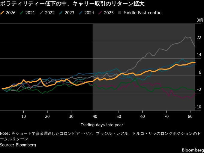ここ数週間、さまざまなキャリー取引を推奨してきたシティグループやゴールドマン・サックス・グループなどは、従来の見方を維持している。円で資金を調達し、ブラジル・レアルやコロンビア・ペソ、トルコ・リラの通貨バスケットに投資するという代表的なキャリー取引は、26年に約12%のリターンを上げており、過去3年で最も順調な滑り出しとなっている。