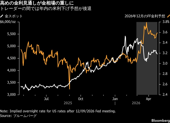 金はここ数週間、中東情勢を巡るニュースが相次ぐ中で狭いレンジで推移している。戦争の初期に投資家が現金確保のため金を売却したこともあり、戦争開始以降ではなお約10%下落している。
