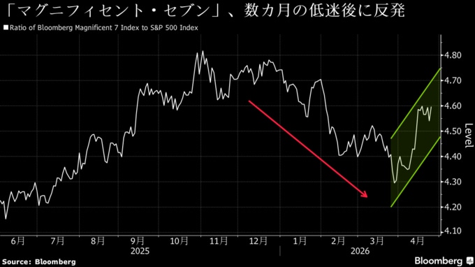 大型ハイテク7銘柄で構成する「マグニフィセント・セブン」は、S&P500種が過去4週間で13%上昇する原動力となってきた。同指数が3月30日に直近の安値を付けて以降、アルファベット、アマゾン、エヌビディア、メタの株価はいずれも25%超上昇している。