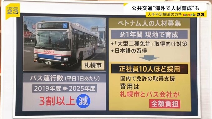 現地で正社員を約10人採用して、日本国内で必要な免許の取得をサポートしています。費用は、札幌市とバス会社が全額負担しています。