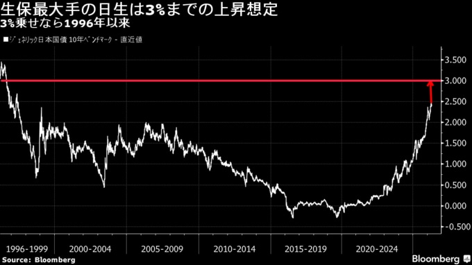 一方、長期金利の3%は日銀が1999年にゼロ金利政策に踏み込む前の水準で、生保各社にとって国内債券で安定的に利回りを確保できる市場環境に回帰することを示唆している。