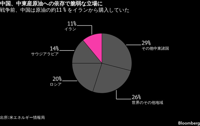 世界最大の原油輸入国で、イラン産原油の最大の購入国でもある中国は、長年にわたる供給源の多様化により影響を抑えている。ブルームバーグ・インテリジェンス(BI)によると、最大14億バレルとされる国家備蓄には手を付けていないが、国有精製企業に商業在庫の一部利用を認めた。