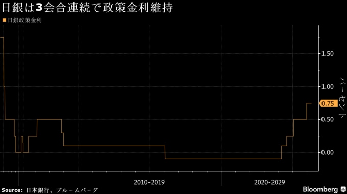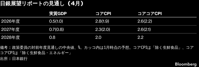(ブルームバーグ):日本銀行は28日の金融政策決定会合で、政策金利を0.75%程度に据え置くことを賛成6・反対3の賛成多数で決めた。新たな経済・物価情勢の展望(展望リポート)を公表し、2026年度の消費者物価見通しを大幅に上方修正した。
