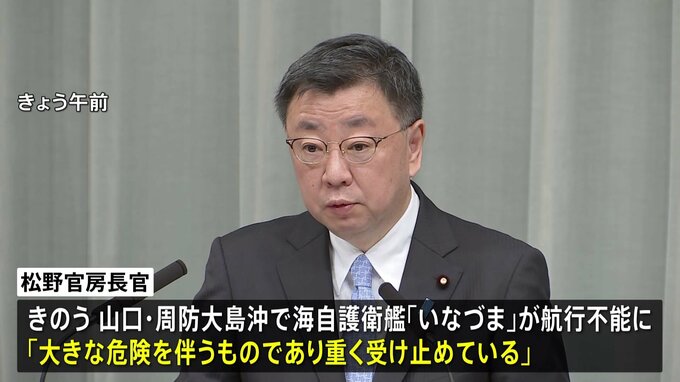 松野官房長官は、きのう午後、山口県の周防大島沖で海上自衛隊の護衛艦「いなづま」が航行不能となったことについて、「大きな危険を伴うものであり、重く受け止めている」と述べました。乗組員への被害については…