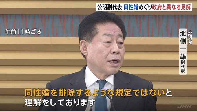 同性婚について、公明党の北側副代表は、憲法改正は必要ない、と政府と異なる見解を示しました。公明党の北側副代表は、憲法24条の「婚姻は両性の合意のみに基づいて成立」とする規定について、「“他者から強制さ…