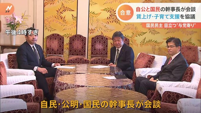 自民・公明と、野党の国民民主党の幹事長が会談し、賃上げと子育て支援をめぐって実務者協議を立ち上げることで合意しました。各党一名ずつ実務者を選び、来週にも議論を開始する方針です。国民民主党は去年、ガソ…