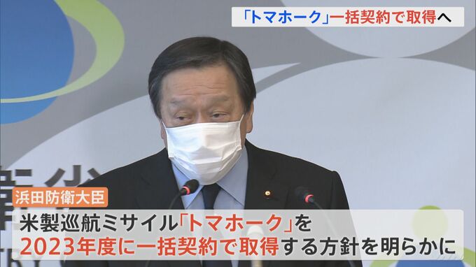浜田防衛大臣は、アメリカ製の巡航ミサイル「トマホーク」について、2023年度に一括契約で取得する方針を明らかにしました。相手のミサイル拠点などを叩く反撃能力をより早期に獲得することや、単価の引き下げが狙…