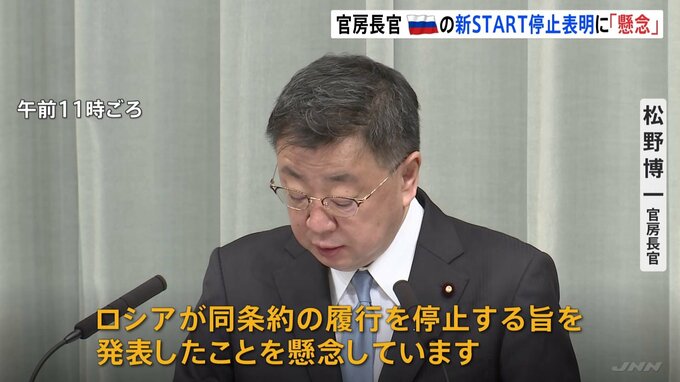 松野官房長官は、ロシアのプーチン大統領がアメリカとの核軍縮の枠組み「新START」=新戦略兵器削減条約の履行停止を発表したことに懸念を示し、「引き続き動向を注視する」と述べました。松野官房長官「新STARTは…