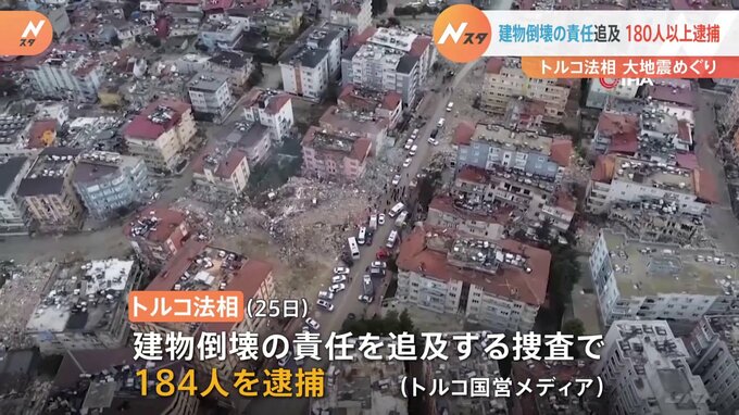 大地震をめぐり、180人以上が逮捕されました。死者が5万人を超えたトルコとシリアの大地震をめぐり、トルコの法相は25日、建物倒壊の責任を追及する捜査で、これまでに184人を逮捕したと明らかにしました。トルコ…