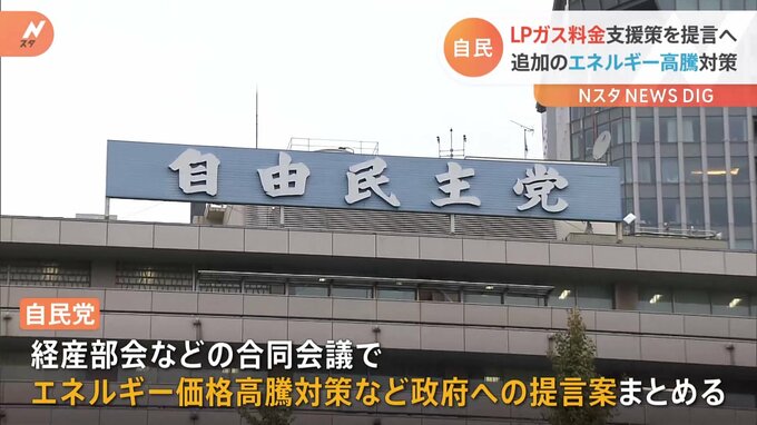 岸田総理が追加の物価高対策の検討を指示したことを受け、自民党は党内の会議でLPガス利用者への支援策などの提言案をまとめました。自民党はきょう、経産部会などの合同会議を開き、エネルギー価格の高騰対策など…