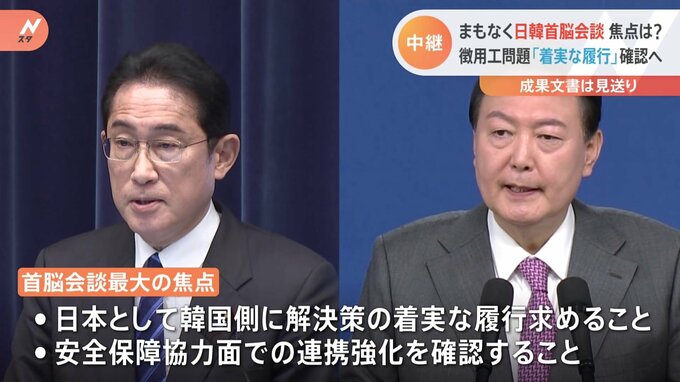まもなく行われる首脳会談、その焦点について政治部の中村記者に中継で伝えてもらいます。大きな転換ともいえる今回の徴用工問題の進展について、政権幹部は尹政権の動きを評価しつつ、「韓国側が自分で掘った穴を…