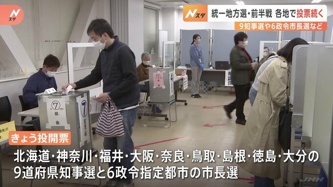 統一地方選の前半戦はきょう投票日を迎え、全国9つの知事選や6つの政令市長選などで投票が続いています。きょう投票が行われているのは、北海道や神奈川など9つの知事選や、札幌や静岡など6つの政令市長選です。こ…