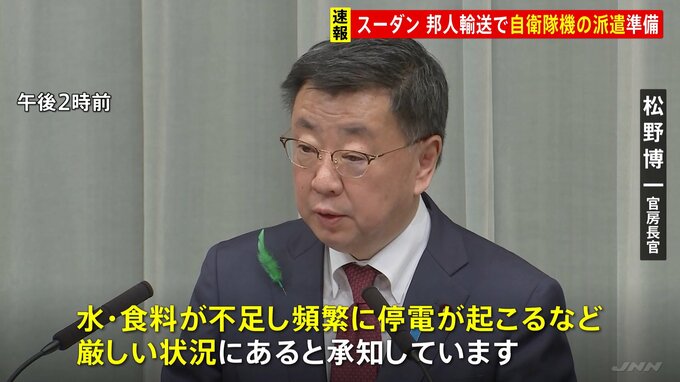 松野官房長官は緊急の記者会見を開き、アフリカ北東部スーダンで続く軍事衝突を受け、内閣危機管理監をトップとする官邸対策室を設置し、日本人の輸送に向け、自衛隊機派遣の準備を始めたと発表しました。松野博一…