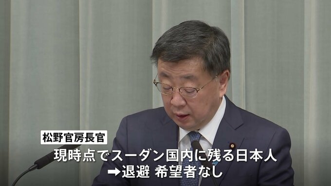 松野官房長官は、スーダン南部に残り、退避を希望していた日本人1人について「退避を希望しないとの連絡があった」と明らかにしました。松野官房長官「24日時点で、退避を希望されていたスーダン南部に滞在する在…