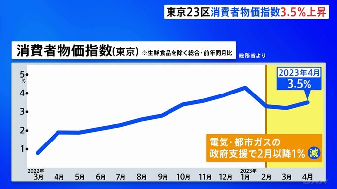 家庭で消費するモノやサービスの値動きをみる東京23区の消費者物価指数は、4月中旬時点の速報値で、去年より3.5%上昇しました。政府の総合経済対策により、電気代や都市ガス代の上昇が抑えられた形です。全国の指…