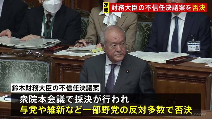 防衛費増額の財源を確保するための特別措置法案をめぐり、立憲民主党が提出した鈴木財務大臣に対する不信任決議案がさきほど、衆議院本会議で与党などの反対多数で否決されました。鈴木財務大臣に対する不信任決議…