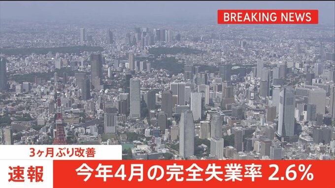 総務省がきょう発表した労働力調査によりますと、全国の4月の完全失業率は前の月から0.2ポイント低下し、2.6%でした。3か月ぶりに改善しました。また、完全失業者は180万人で、前の月から減少しています。