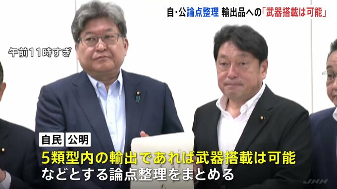「防衛装備移転三原則」の運用指針の見直しについて協議してきた自民・公明両党の実務者は、一定の条件のもとで輸出品への「武器搭載は可能」などとする論点整理をまとめました。防衛装備品の輸出ルールを定めた「…