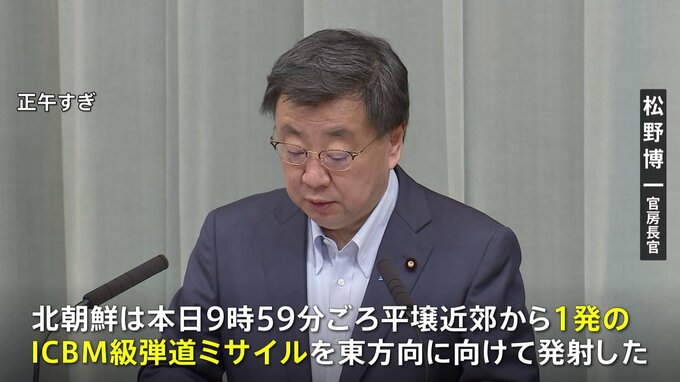 北朝鮮が発射したICBM=大陸間弾道ミサイルについてです。日本のEEZ=排他的経済水域の外側に落下したとみられていますが、飛翔時間が過去最長だったことがわかりました。松野博一 官房長官「北朝鮮は本日9時59分…
