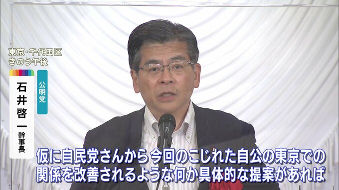 公明党の石井幹事長は23日、次の衆議院選挙で解消するとしていた自民党との東京での選挙協力について、「自民党から具体的な提案があれば、関係改善はあり得る」と話しました。公明党 石井啓一 幹事長「仮に自民…
