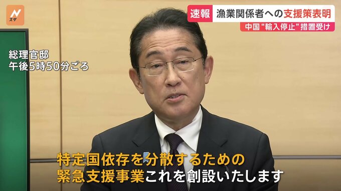 中国が日本の水産物の輸入を全面停止したことを受け、岸田総理は、中国市場に依存しないための緊急支援事業を創設するなどの漁業者支援策を発表しました。岸田総理「特定国依存を分散するための緊急支援事業、これ…