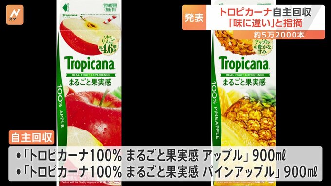 キリンビバレッジは「トロピカーナ」ブランドのジュースの一部商品の味に違いがあるとして、およそ5万2000本の自主回収を発表しました。自主回収の対象となるのは、900ミリリットル入りの「トロピカーナ100%まるご…
