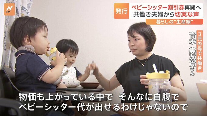 政府が停止していた発行を再開すると発表した「ベビーシッター割引券」。その背景にあったのは利用者の切実な「声」でした。都内で暮らす青木美友貴さん(34)。1歳の双子と7か月の子ども、3人を育てながら働く「…