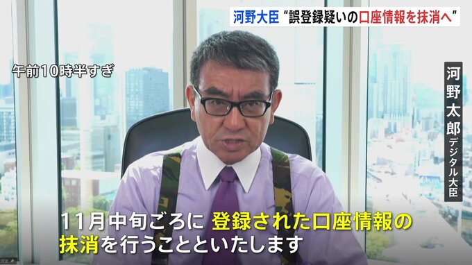 マイナンバーに他人の公金受取口座の情報が誤って紐付けられている問題で、河野デジタル大臣は誤登録の疑いのあるおよそ600件について、紐付け情報の抹消を行うことを明らかにしました。河野太郎デジタル大臣「11…