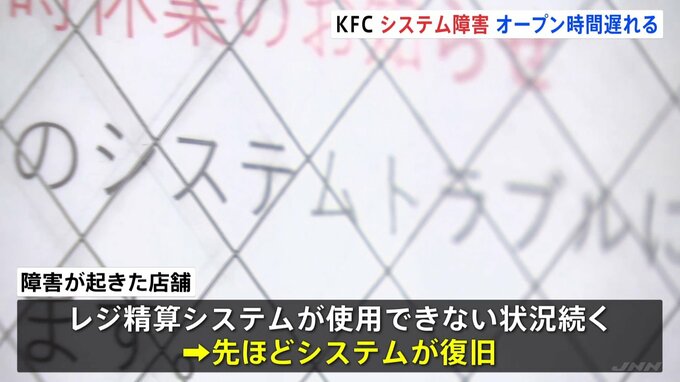 日本ケンタッキー・フライド・チキンは、精算システムに障害が発生し、一部店舗でオープン時間を遅らせたと発表しました。現在、システムは復旧し、順次、開店作業を進めているということです。日本ケンタッキー・…