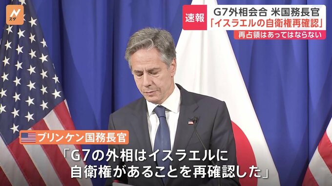 G7=主要7か国の外相会合は2日間の日程を終え、戦闘が激しさを増す中東情勢などが議論され、「戦闘の人道的休止」を盛り込んだ共同声明が発表されました。上川陽子外務大臣「G7として、ハマス等のテロ攻撃を断固と…