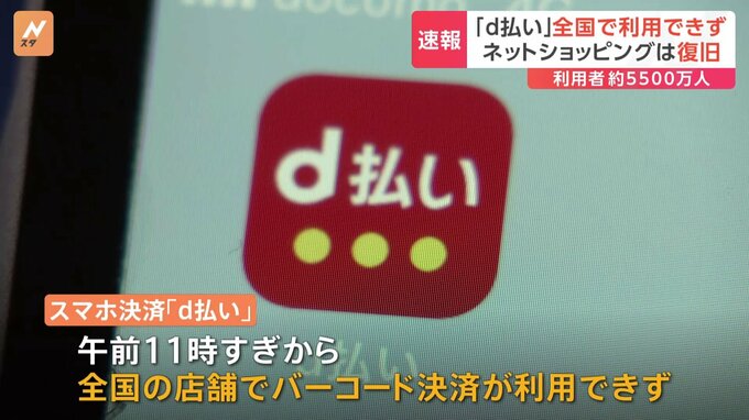 NTTドコモのスマートフォン決済サービス、「d払い」の一部のサービスが全国で利用できない状態となっています。午前11時すぎから利用できなくなっているのは、NTTドコモのスマートフォン決済サービス・「d払い」で…