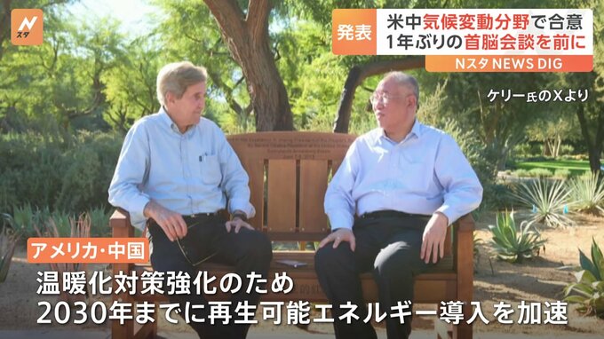 日本時間のあす行われるバイデン大統領と習近平国家主席の首脳会談を前に、アメリカと中国が気候変動分野での合意を発表しました。アメリカと中国は、今月4日からカリフォルニア州で行われた気候変動担当のケリー…
