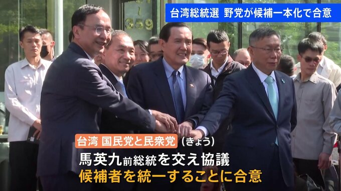 2か月後の台湾総統選。情勢が変わる可能性です。馬英九前総統「国民党と民衆党のきょうの協議は合意に達した。われわれは合意事項に基づき、全力で取り組む」台湾の最大野党・国民党と第三勢力の民衆党はきょう、…