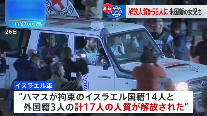 イスラエル軍とイスラム組織ハマスの合意に基づき、3回目の人質の解放が行われ、17人が解放されました。この中にはアメリカ国籍の女の子も含まれているということです。イスラエル軍によりますと、戦闘の一時停止3…