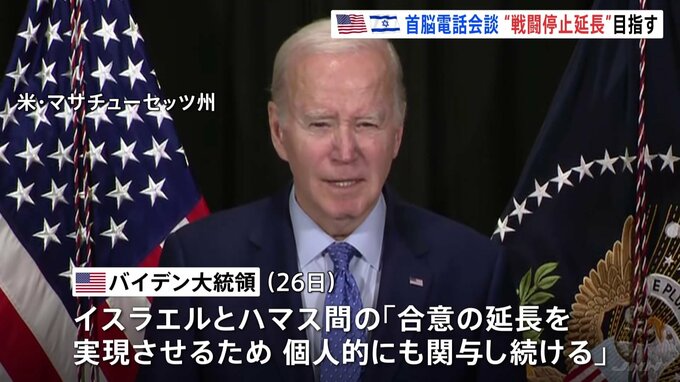 アメリカのバイデン大統領はネタニヤフ首相と電話会談するなど、人質のさらなる解放に向け、戦闘停止の延長を目指していることを明らかにしました。アメリカ バイデン大統領「我々が目標とするのは、月曜日以降も…
