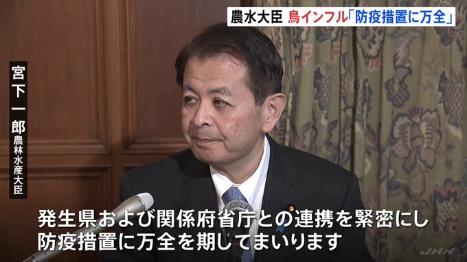 国内の養鶏場で鳥インフルエンザの感染が相次いで確認されたことを受け、宮下農林水産大臣は「防疫措置に万全を期す」と強調しました。宮下一郎 農林水産大臣「発生県および関係府省庁との連携を緊密にし、防疫措…