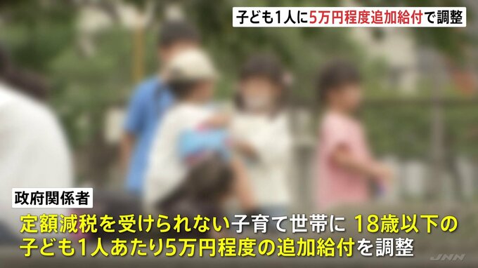 来年6月に予定している所得税などの定額減税を受けられない子育て世帯に対し、政府が子ども1人あたり5万円程度を追加で給付する方向で調整を進めていることが分かりました。政府は来年6月にも所得税3万円と住民税1…