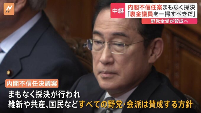 国会では現在、衆議院本会議が開かれていて、立憲民主党が提出した岸田内閣への不信任決議案の採決が行われます。国会から中継です。衆議院本会議で、立憲民主党の泉代表は自民党の政治資金問題について「社会全体…