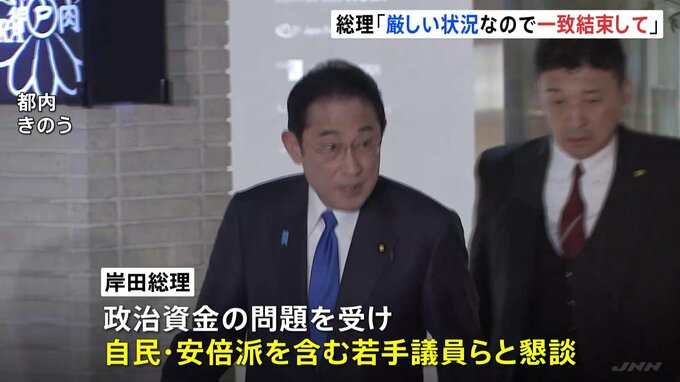 政治資金の問題を受け、岸田総理はきのう夜、東京都内で自民党・安倍派を含む若手議員らと懇談しました。出席者によりますと、「こういう厳しい状況なので、みんなで一致結束して頑張ろう」と呼びかけたということ…