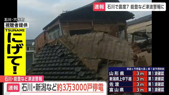 地震による電気などの状況です。経済産業省によりますと、きょう午後7時時点で石川県や新潟県などで、およそ3万3000戸の停電が発生しているということです。具体的には、▼東北電力管内で新潟県でおよそ1500戸、▼…